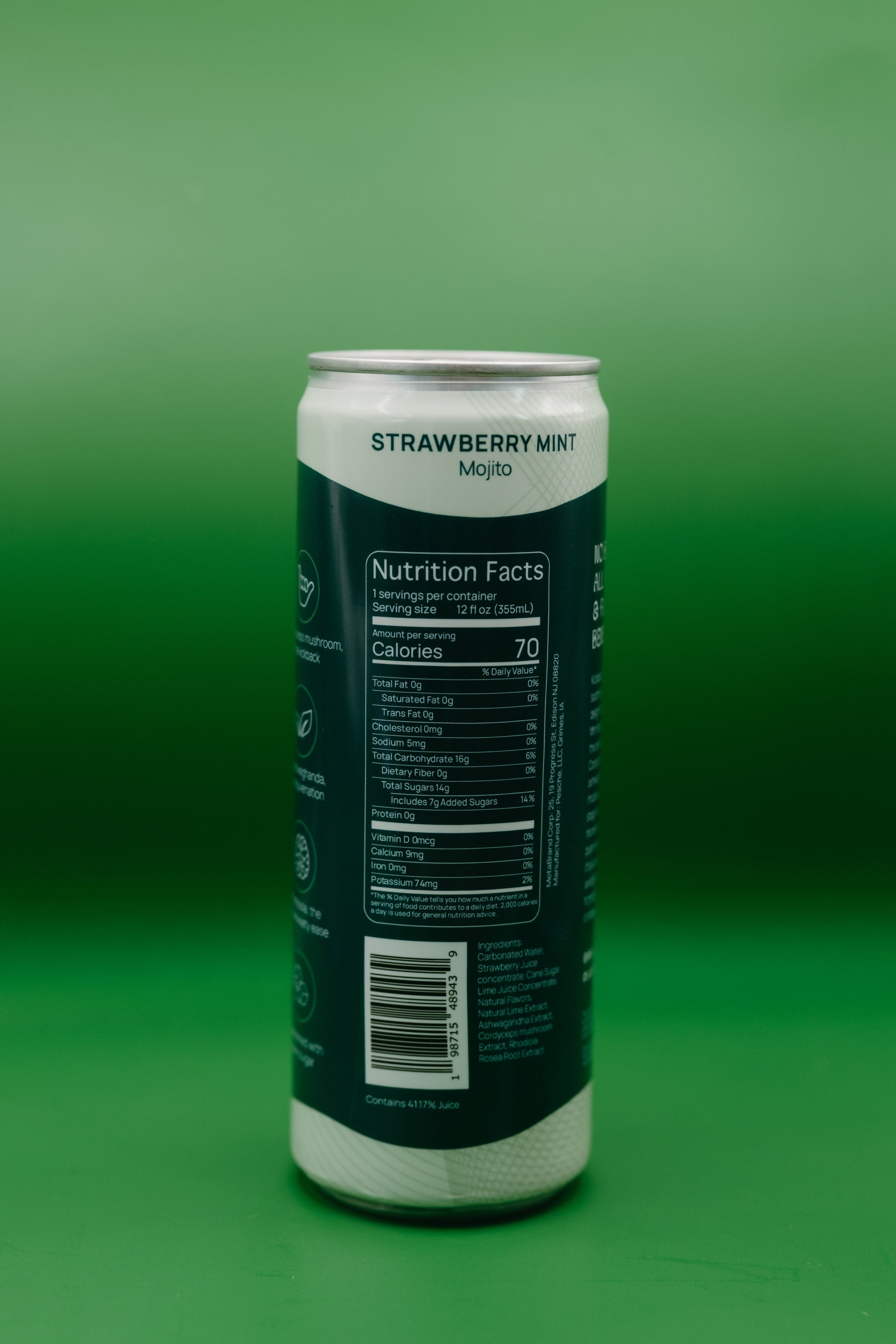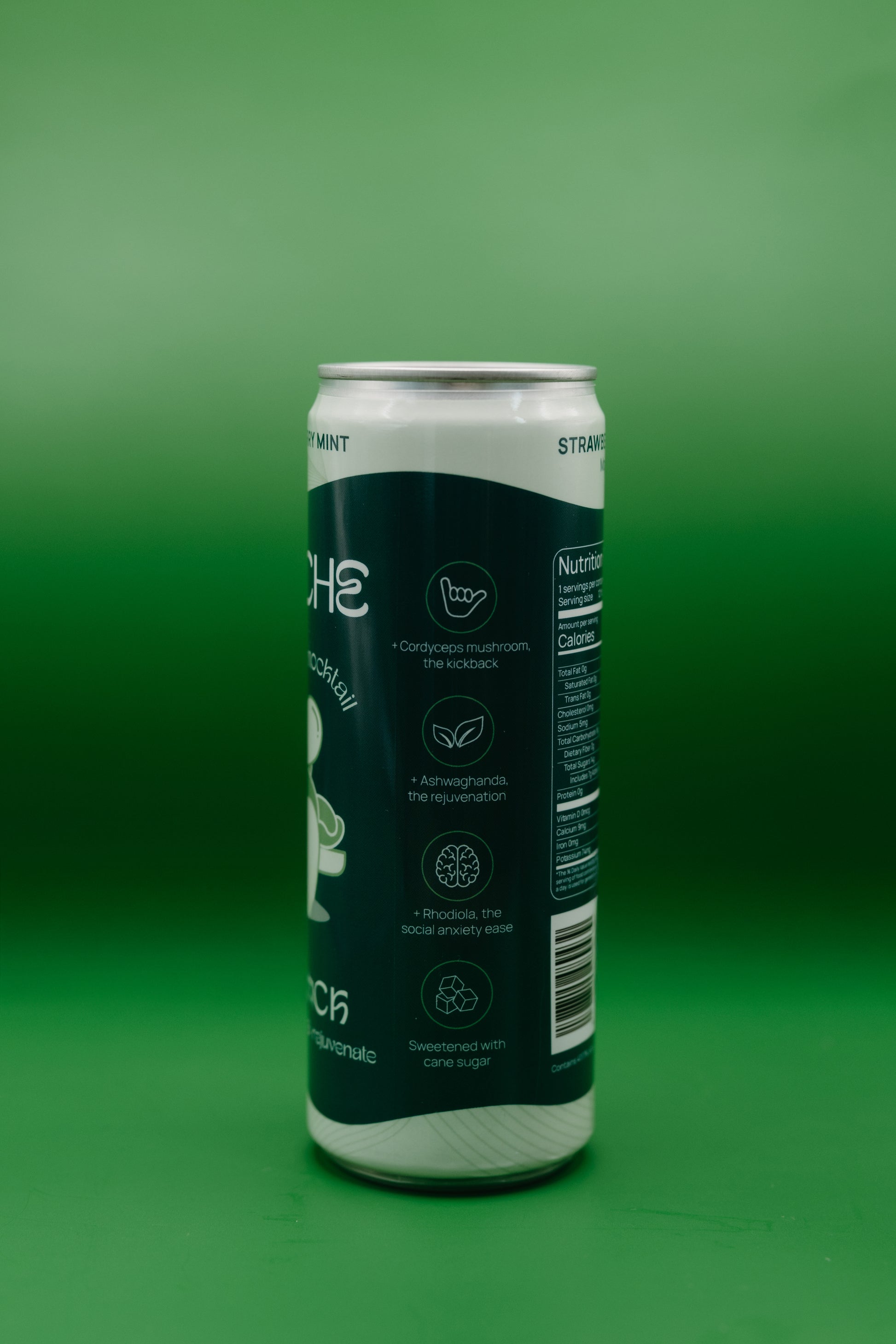 Carbonated Water, Strawberry Juice Concentrate, Cane Sugar, Lime Juice Concentrate, Natural Flavors, Natural Lime Extract, Ashwagandha Extract, Cordyceps Mushroom Extract, Rhodiola Rosea Root Extract.